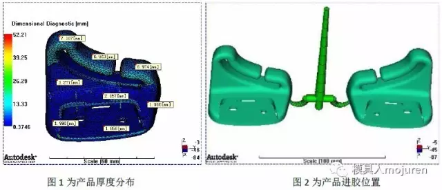 此產品為汽車安全帶固定件: 產品最大外形尺寸:70*45*63,產品平均肉厚:1.8~7.0mm,產品肉厚差異較大,因此采用3D網格分析,如圖1所示。材料:ABS+PA6-GF8 Terblend N NG-02 : BASF .此材料已做修正,質量指示器為銀級,此材料可信度較高。 模具為一模兩件,由于產品量大,因此進膠方式為冷流道隧道澆口進膠,如圖2所示。